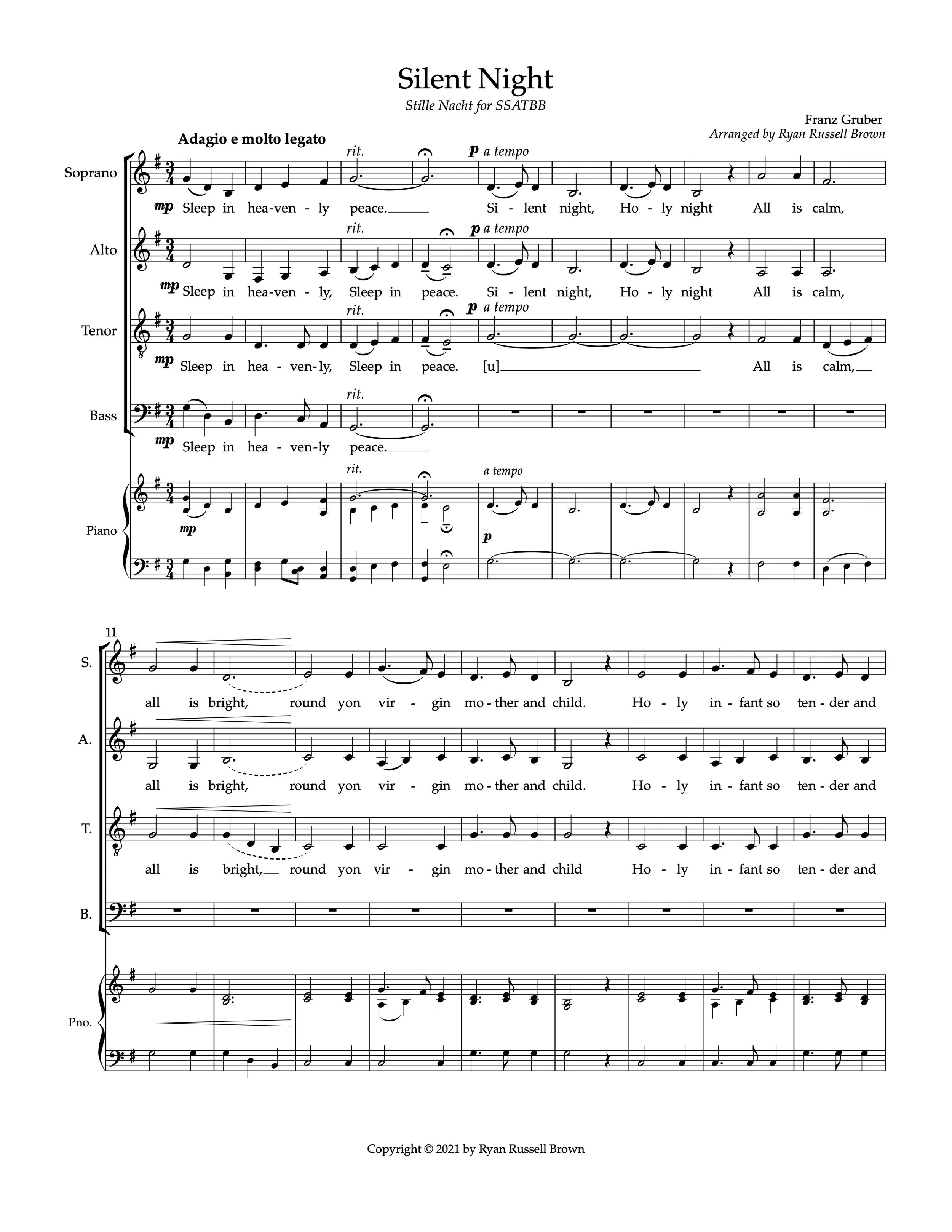 A beautiful SATB arrangement of the classic Christmas carol by Franz Gruber. This arrangement explores some new harmonic colours while maintaining the beauty, reverence, and delicate nature of the original.